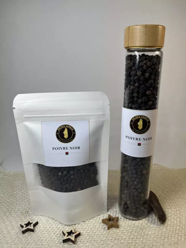 Poivre noir en grains origine Madagascar, sélectionné pour sa belle taille et son arôme puissant. Goût riche et profond, parfait pour grillades, marinades et plats mijotés.