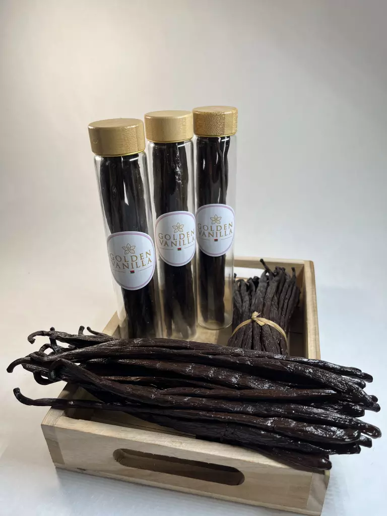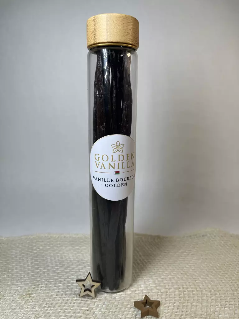 La Vanille Bourbon Golden Vanilla est le joyau de notre collection. Issue des plus belles plantations malgaches, elle se distingue par ses gousses longues, épaisses et parfaitement maturées, sélectionnées une à une selon des critères stricts de qualité.